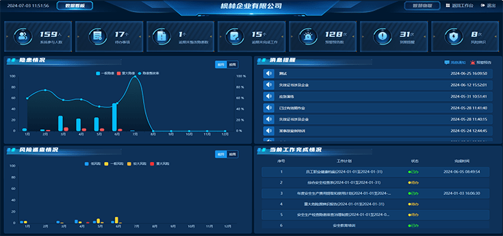 構(gòu)建可視化數(shù)據(jù)中心看板集成匯總企業(yè)安全生產(chǎn)運(yùn)行數(shù)據(jù),涵蓋隱患情況、風(fēng)險巡查情況、工作完成情況、預(yù)警預(yù)告情況、到期提醒、物聯(lián)報警等,便于負(fù)責(zé)人全盤掌握企業(yè)安全管理動態(tài)。
