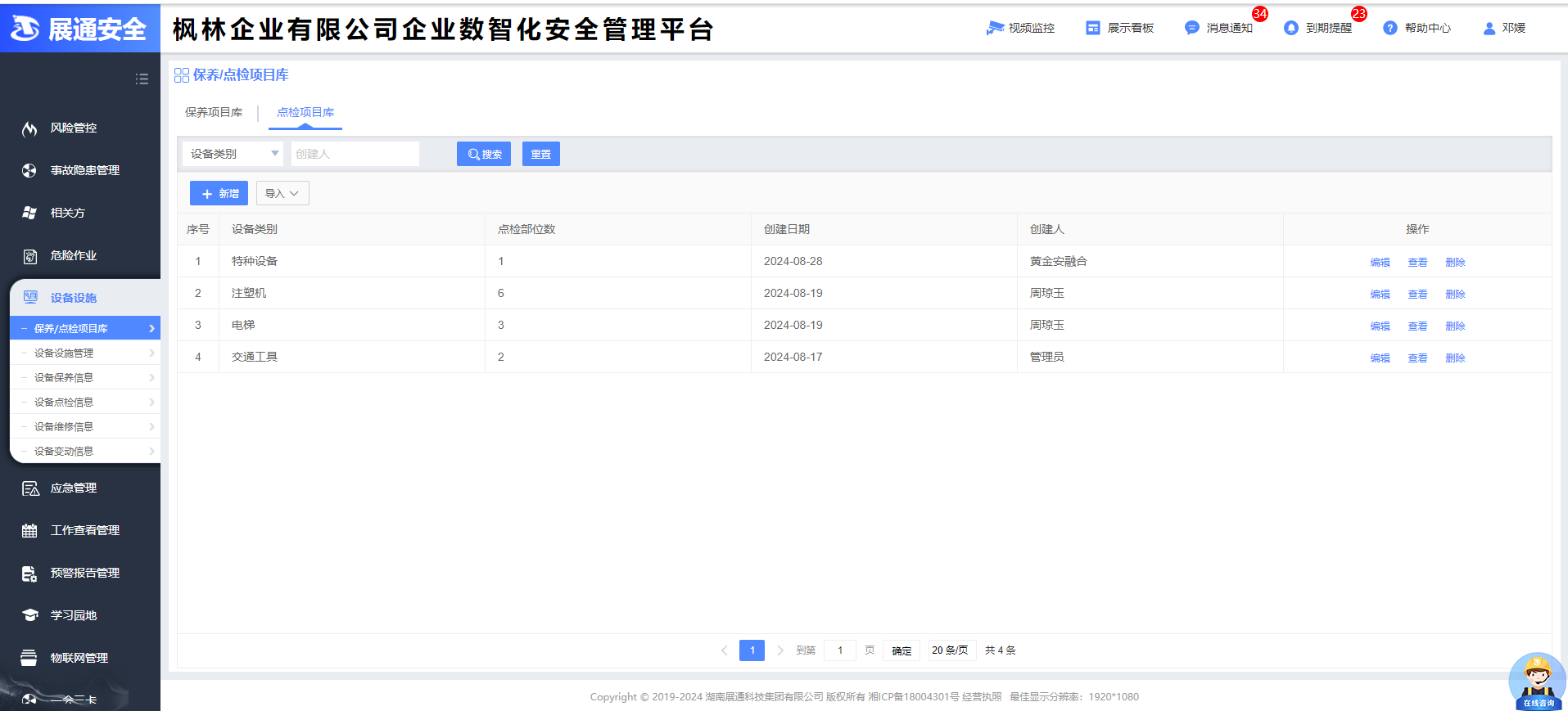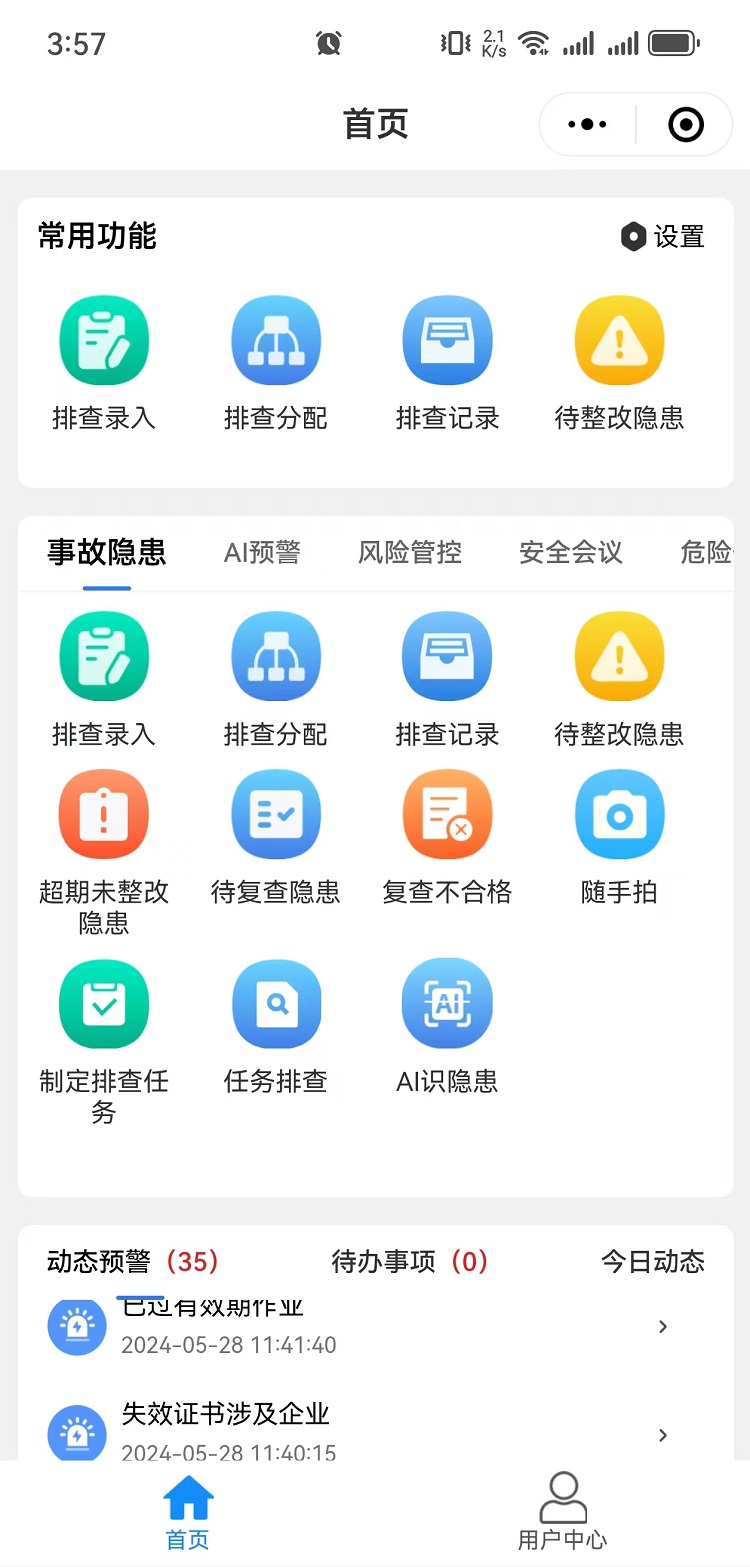 企業(yè)數(shù)智化安全管理平臺(俗稱企業(yè)端)匯集企業(yè)管理、風(fēng)險管控、隱患管理、體系運(yùn)行、危險作業(yè)、AI預(yù)警、AI識隱患、應(yīng)急管理、預(yù)警動態(tài)、一會三卡、物聯(lián)網(wǎng)管理、相關(guān)方、設(shè)備設(shè)施、學(xué)習(xí)園地等功能于一體,旨在構(gòu)建標(biāo)準(zhǔn)化、規(guī)范化、便捷化的管理流程,引導(dǎo)企業(yè)自主開展安全管理工作,建立健全全員安全生產(chǎn)責(zé)任制,全面提升企業(yè)安全管理數(shù)智化水平。