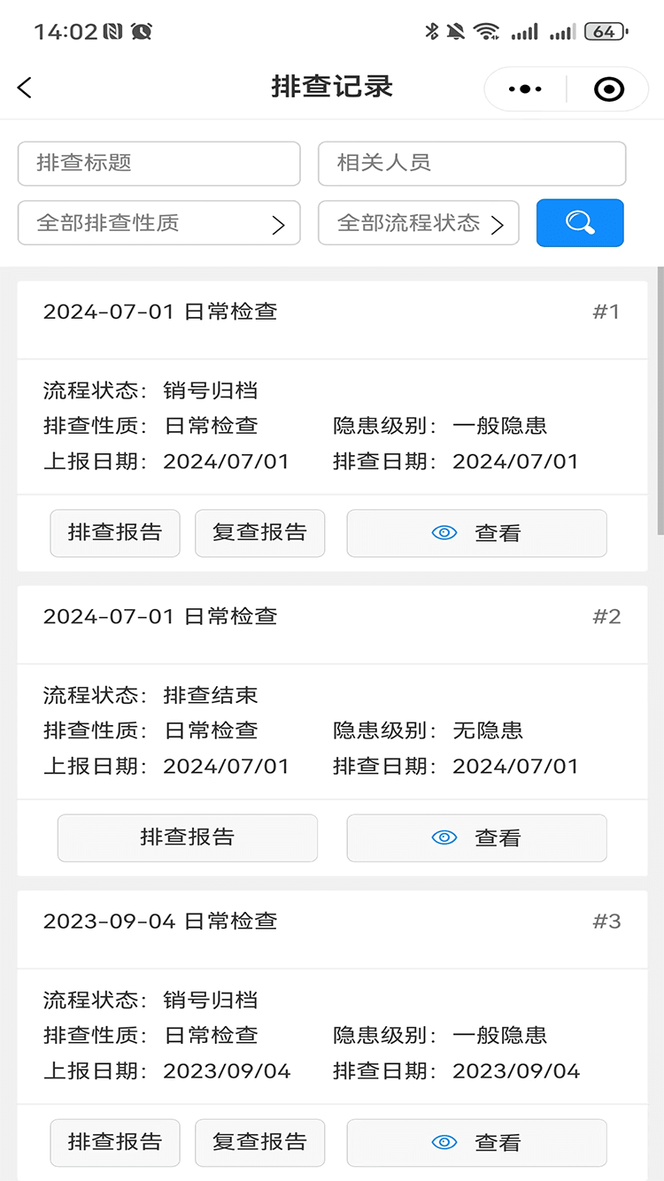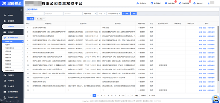 企業(yè)安全管理人員可依托檢查表庫、隱患數(shù)據(jù)庫或者自主新增,完成隱患的排查、上報、整改、復(fù)查、歸檔等一系列流程運(yùn)轉(zhuǎn),實現(xiàn)隱患閉環(huán)管理;根據(jù)隱患排查治理信息,自動生成安全檢查報告,支持線上打印及一鍵導(dǎo)出。