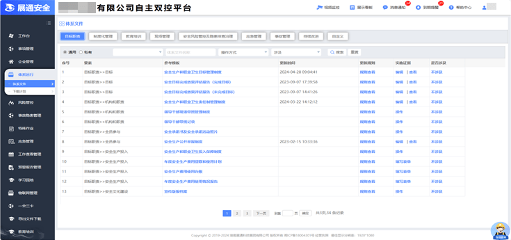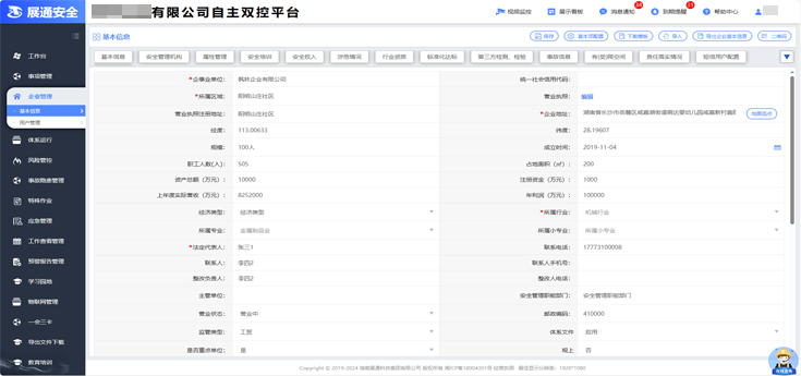 系統(tǒng)提供企業(yè)基本信息、安全管理架構(gòu)、安全投入、涉危情況、行業(yè)資質(zhì)、安全培訓(xùn)、職業(yè)衛(wèi)生、涉塵涉爆、有(受)限空間、第三方檢測、檢驗等15個功能模塊,可根據(jù)企業(yè)實際情況進(jìn)行選用。