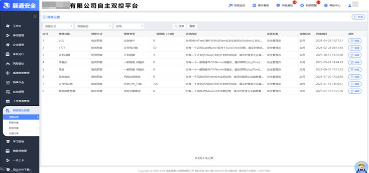 平臺提供隱患管理超期、證照(預(yù))超期、工作計劃實施、風(fēng)險定期巡檢、物聯(lián)感知、應(yīng)急事件等多方面的預(yù)警,依需設(shè)置預(yù)警規(guī)則,支持短信、電話、微信等多途徑消息推送,實時提醒相關(guān)責(zé)任人進(jìn)行處理;