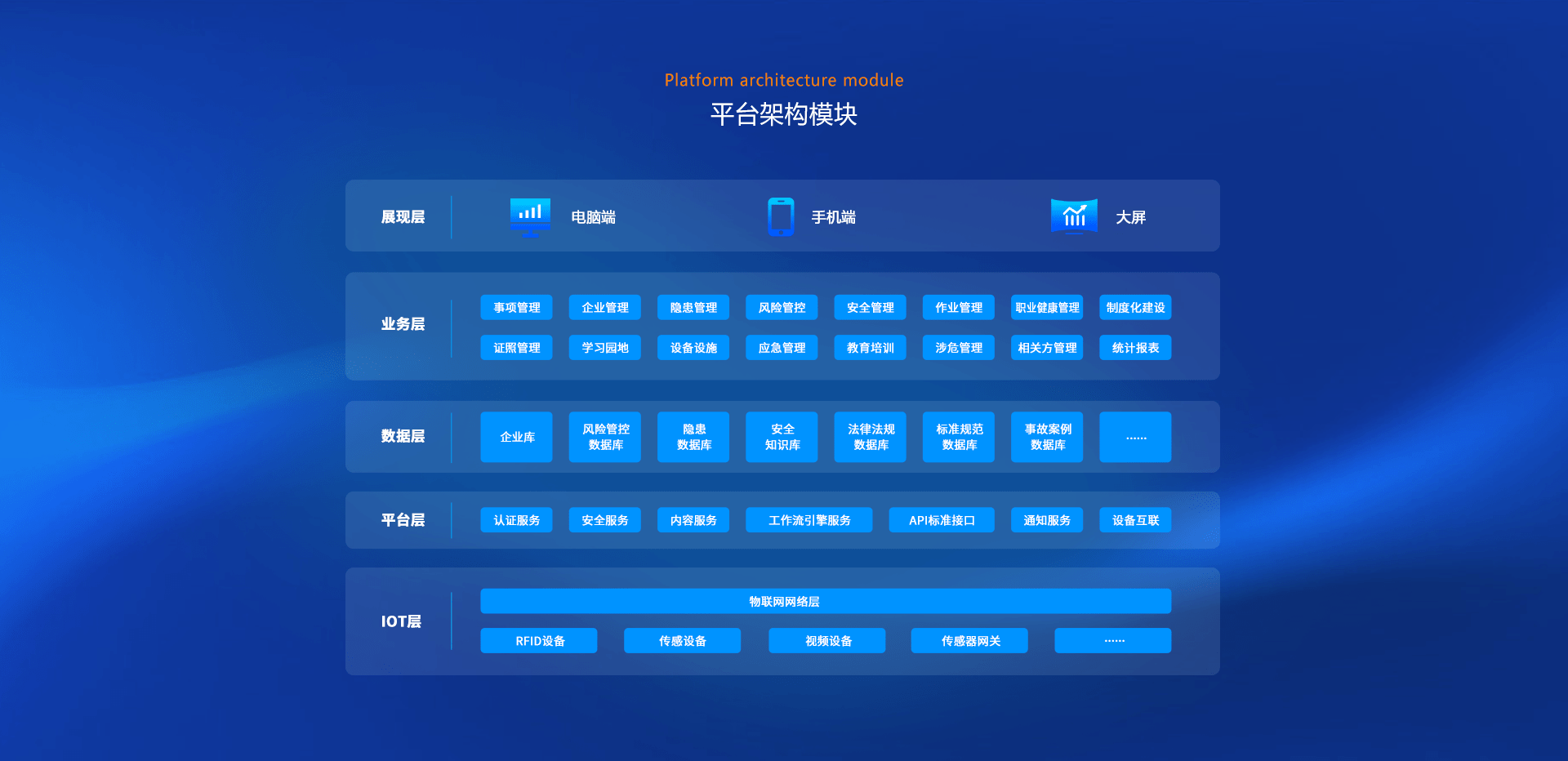 該平臺基于國家安全生產(chǎn)法律法規(guī)要求及國內(nèi)外安全管理的先進(jìn)經(jīng)驗(yàn),從系統(tǒng)安全管理的角度出發(fā),利用互聯(lián)網(wǎng)、物聯(lián)網(wǎng)、大數(shù)據(jù)應(yīng)用技術(shù),旨在打造全方位的安全管理體系。通過標(biāo)準(zhǔn)化業(yè)務(wù)模塊、全面風(fēng)險管控機(jī)制、職責(zé)統(tǒng)一的業(yè)務(wù)流,專業(yè)化的安全數(shù)據(jù)支撐、可視化的數(shù)據(jù)呈現(xiàn),提升安全管理效能,實(shí)現(xiàn)企業(yè)安全生產(chǎn)主體責(zé)任落實(shí)到位、全員全過程參與安全管理,建立企業(yè)安全生產(chǎn)長效機(jī)制,構(gòu)建安全管理健康有序發(fā)展的良性格局。