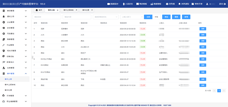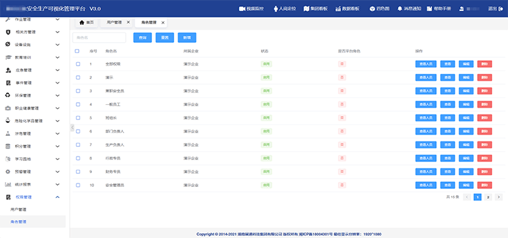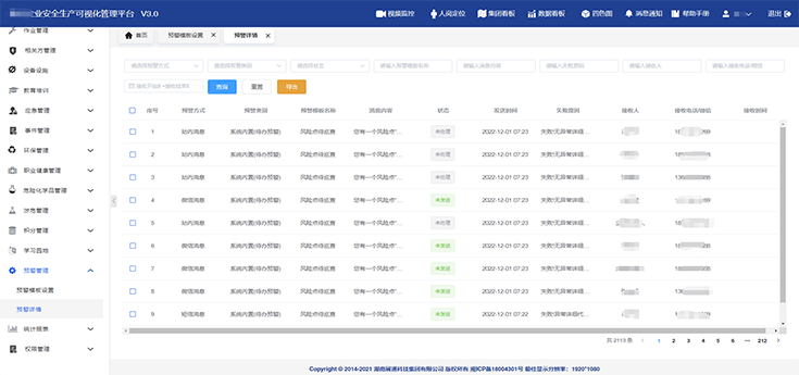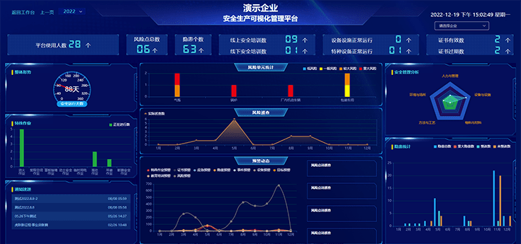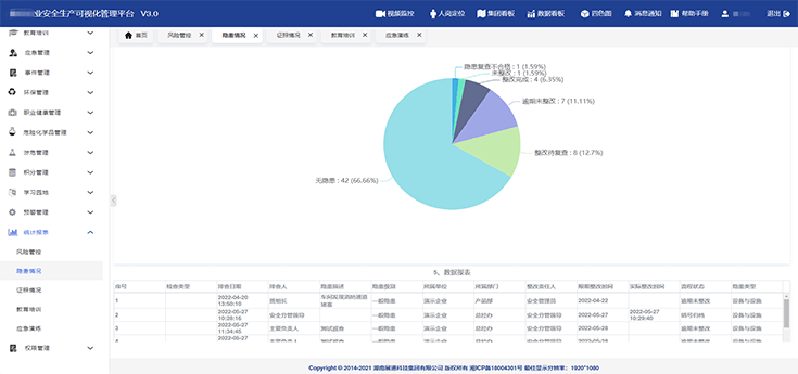 可實(shí)現(xiàn)風(fēng)險管控、隱患情況、教育培訓(xùn)、證照管理、應(yīng)急演練等不同維度數(shù)據(jù)統(tǒng)計分析,智能生成數(shù)據(jù)報表,為,為決策層制定安全目標(biāo)和方針提供精準(zhǔn)的數(shù)據(jù)支撐。