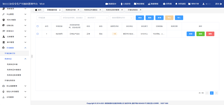 環(huán)境因素識別:可實(shí)現(xiàn)可環(huán)境因素的狀態(tài)、時態(tài)、環(huán)境影響、控制措施的實(shí)時把控,形成環(huán)境因素識別清單;