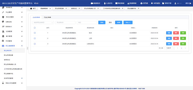 進(jìn)行職業(yè)病危害因素識別、管理,智能生成職業(yè)危害告知卡,建立職業(yè)危害人員/崗位臺賬,進(jìn)行職業(yè)危害場所檢測,上傳職業(yè)健康體檢報告,建立職業(yè)健康管理檔案。