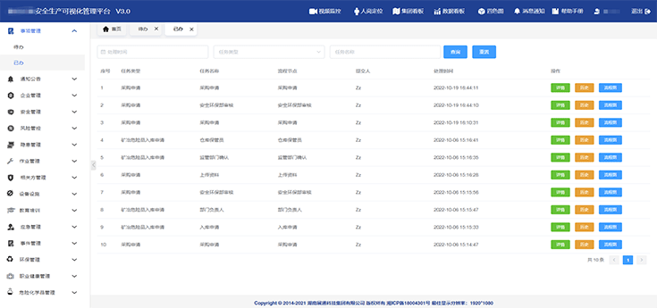 系統(tǒng)根據(jù)登錄用戶角色與權(quán)限,提取了用戶應(yīng)及時進(jìn)行的工作,在待辦事項(xiàng)中集中展示,方便高效開展安全生產(chǎn)工作;已辦事項(xiàng)記錄了用戶的工作痕跡,以及用戶參與的工作的流轉(zhuǎn)過程。