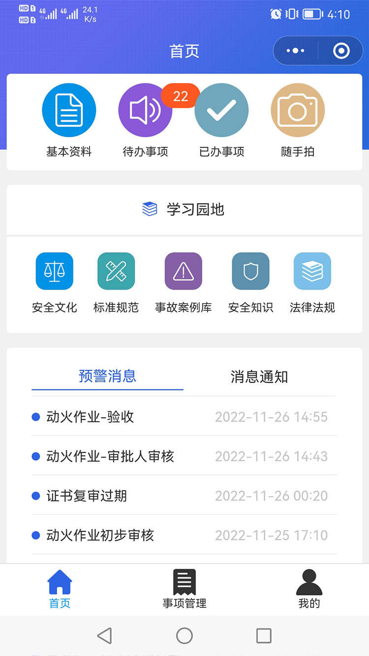 配置相應(yīng)預(yù)警規(guī)則,可實(shí)現(xiàn)隱患整改/復(fù)查、隨手拍審核、風(fēng)險巡查、證照審核、證件預(yù)過期、特殊作業(yè)流程審批、演練計劃、應(yīng)急值守等各類工作事項(xiàng)預(yù)警,及時推送至相關(guān)負(fù)責(zé)人,提醒其進(jìn)行工作處理。