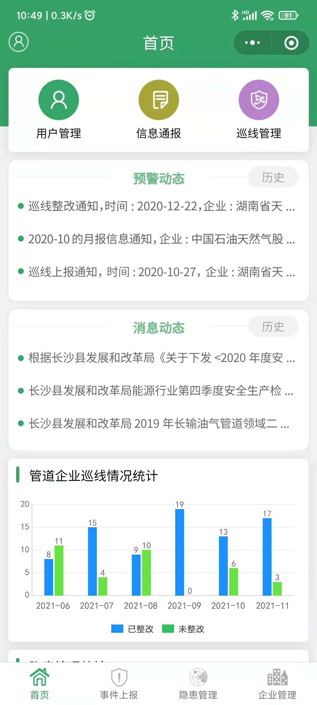 平臺(tái)配置了手機(jī)端小程序,安全監(jiān)管人員、鎮(zhèn)街人員、管道企業(yè)人員皆可通過(guò)小程序隨時(shí)開展日常管理工作,快速增強(qiáng)工作便利性,持續(xù)提升安全工作的信息化水平。